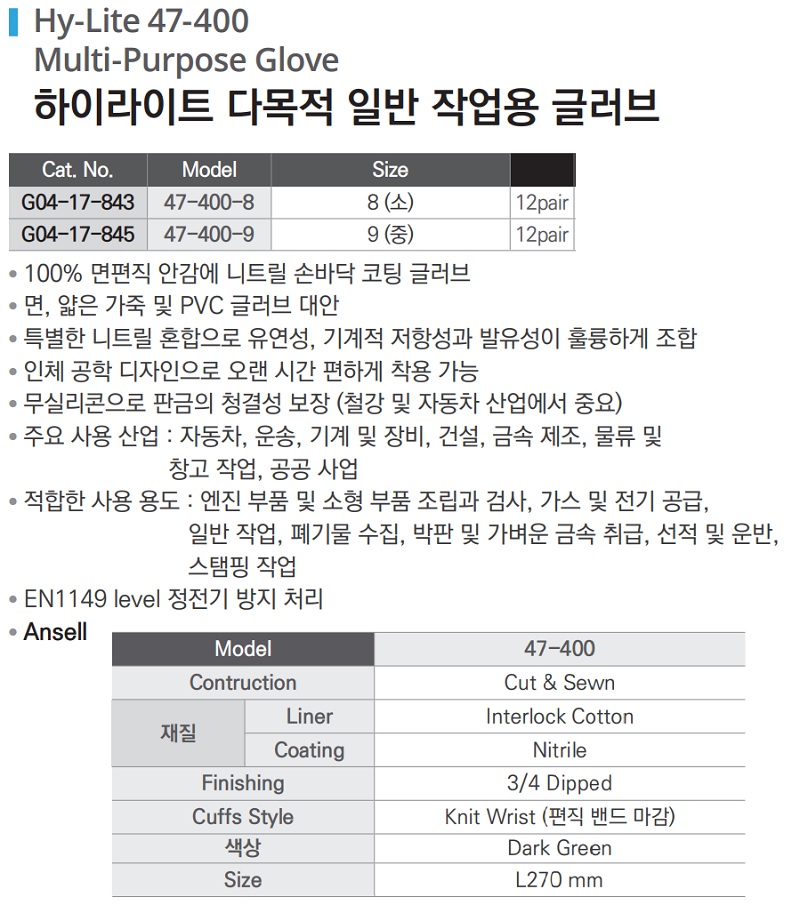 품명 ■ 100% 면편직 안감에 니트릴 손바닥 코팅 글러브 ■ 면, 얇은 가죽 및 PVC 글러브 대안 ■ 특별한 니트릴 혼합으로 유연성, 기계적 저항성과 발유성이 훌륭하게 조합 ■ 인체공학 디자인으로 오랜 시간 편하게 착용 가능 ■ 무실리콘으로 판금의 청결성을 보장 (철강 및 자동차 산업 에서 중요) ■ 주요 사용산업 : 자동차, 운송, 기계 및 장비, 건설, 금속 제조, 물류 및 창고 작업, 공공사업 ■ 적합한 사용용도 : 엔진부품 및 소형 부품 조립과 검