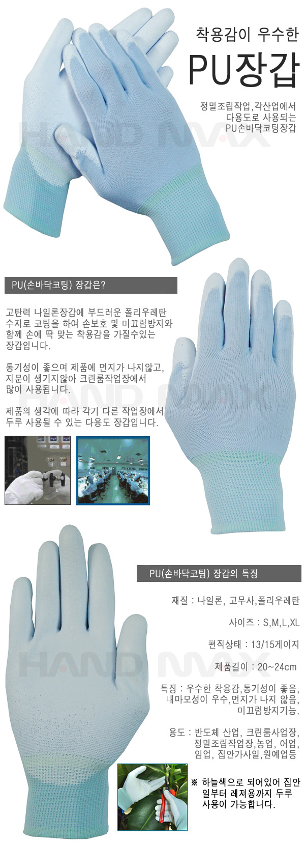 PU-PALM 스카이블루(나일론/국산) 손바닥코팅 다용도장갑 10켤레