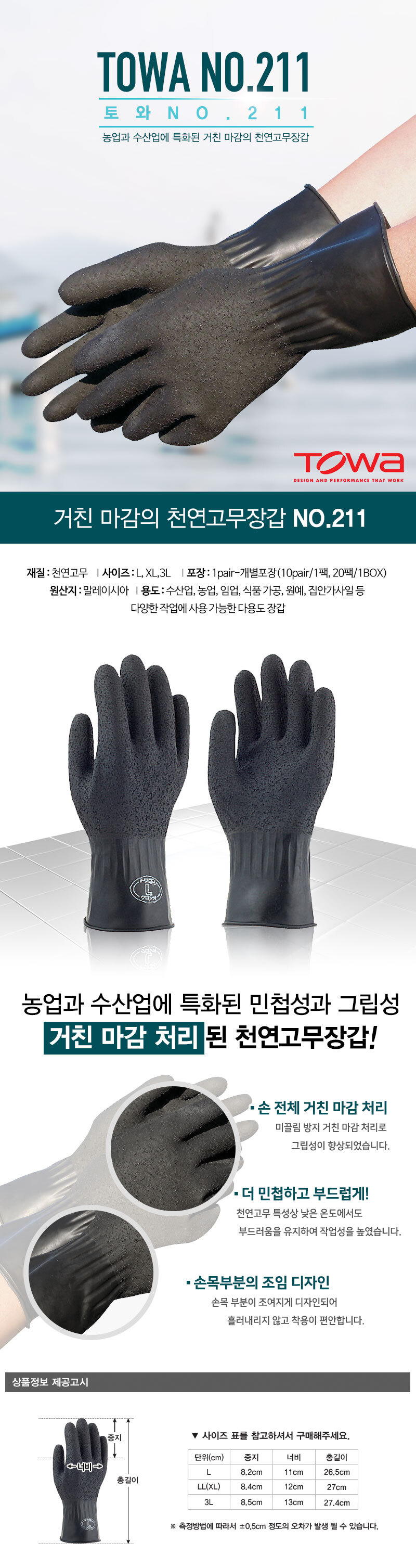 품명 ■ 손 전체 거친 마감처리로 미끌림 방지 ■ 천연고무 특성상 낮은 온도에서도 부드러움을 유지 시켜줌