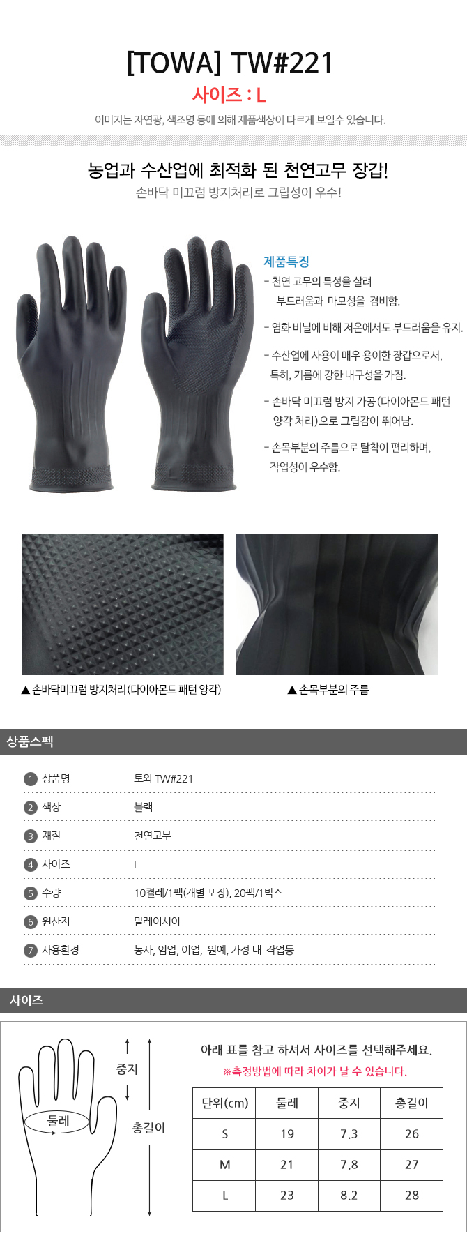 품명 ■ 천연 고무의 특성을 살려 부드러움과 마모성을 겸비함 ■ 수산업에 사용이 매우 용이한 장갑으로서 특히, 기름에 강한 내구성을 가짐