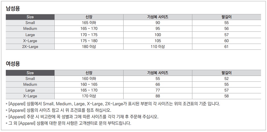 - ● [Apparel] 상품에서 Small, Medium, Large, X-Large, 2X-Large가 표시된 부분의 각 사이즈는 위 조견표의 기준 입니다.