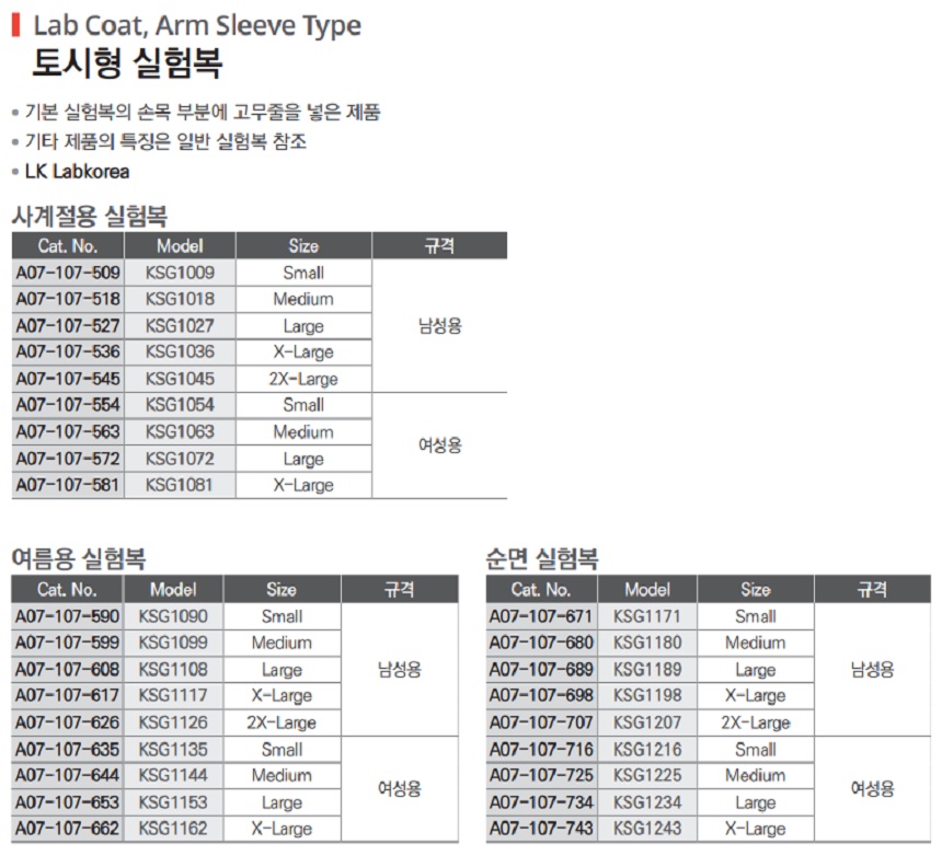 ■ 기타 제품의 특징은 일반 실험복 참조