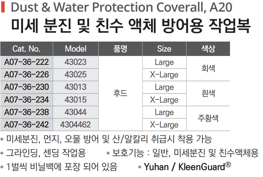 품명 ■ 미세분진, 먼지, 오물 방어 및 산/알칼리 취급시 착용 가능 ■ 그라인딩, 센딩 작업용 ■ 보호기능 : 일반, 미세분진 및 친수액체용 ■ 1벌씩 비닐백에 포장 되어져 있음 ■ Yuhan / KleenGuard®