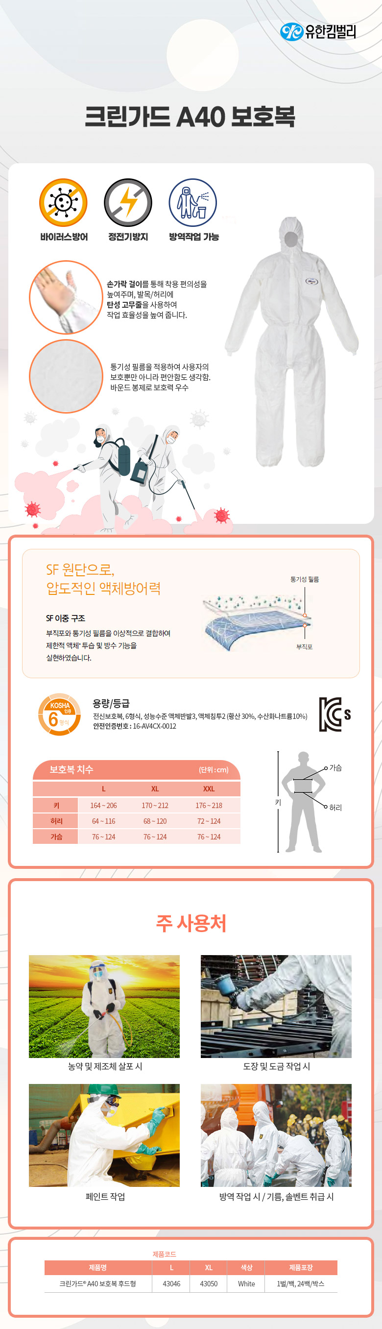크린가드 A40 전신 보호복 후드형 흰색 작업복 1EA/24PK 43046