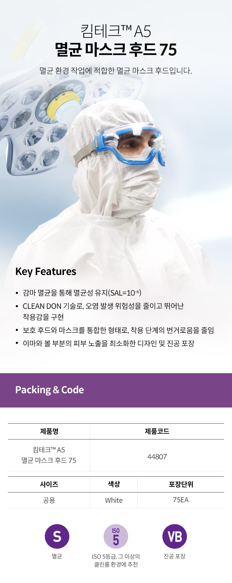 품명 감마 멸균을 통해 멸균성 유지, CLEAN DON 기술로 오염 발생 위험성을 줄이고 뛰어난 착용감을 구현
