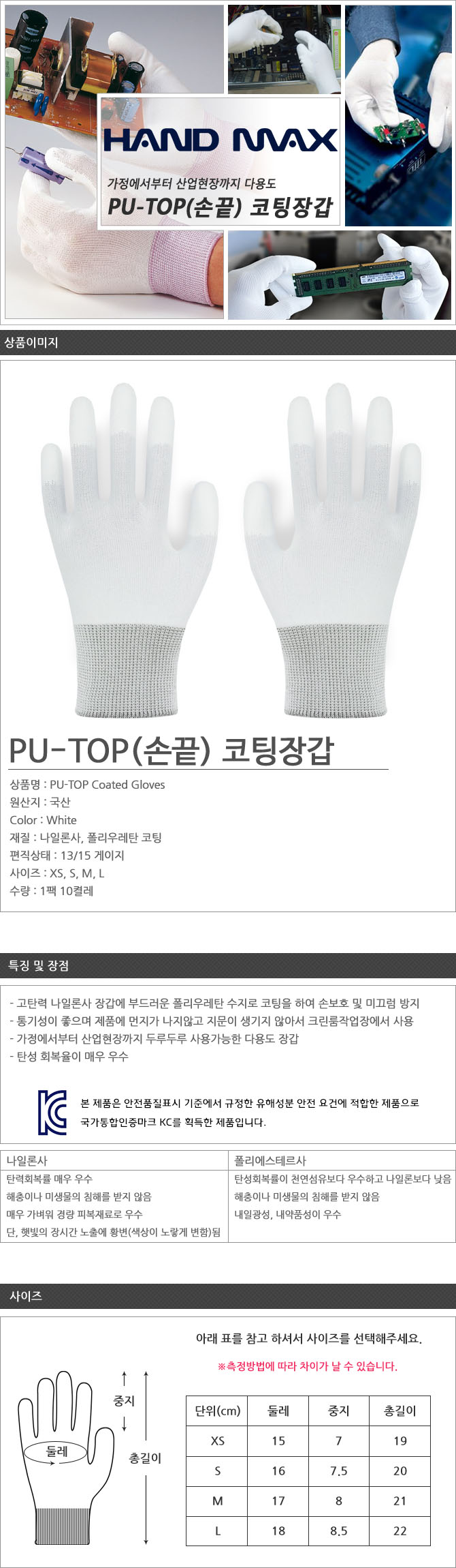 PU-TOP흰색(나일론) 손끝코팅 크린룸장갑 다용도장갑 10켤레