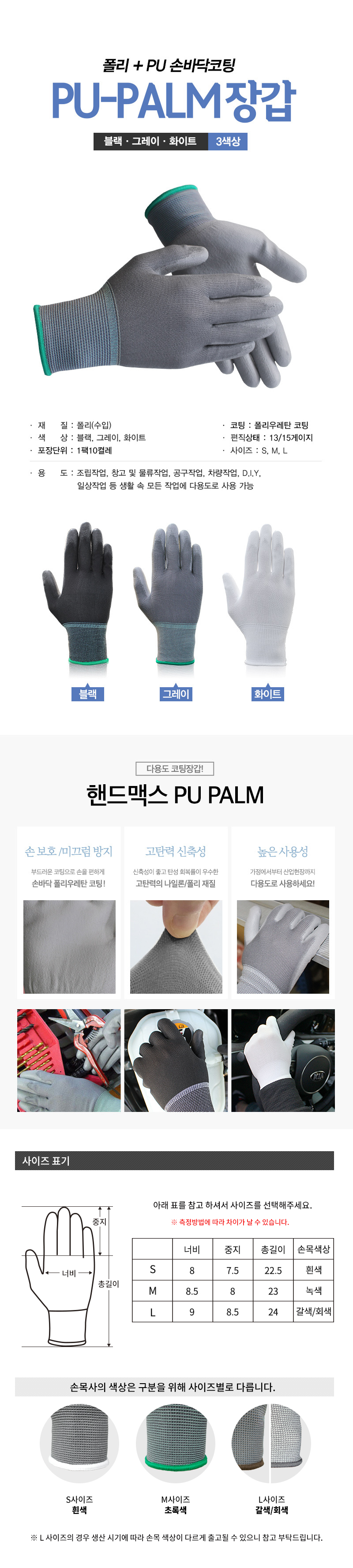 품명 ■ 부드러운 코팅으로 손을 편안하게 손바닥 폴리우레탄 코팅 ■ 신축성이 좋고 탄성회복률이 우수한 고탄력의 나일론/폴리 재질