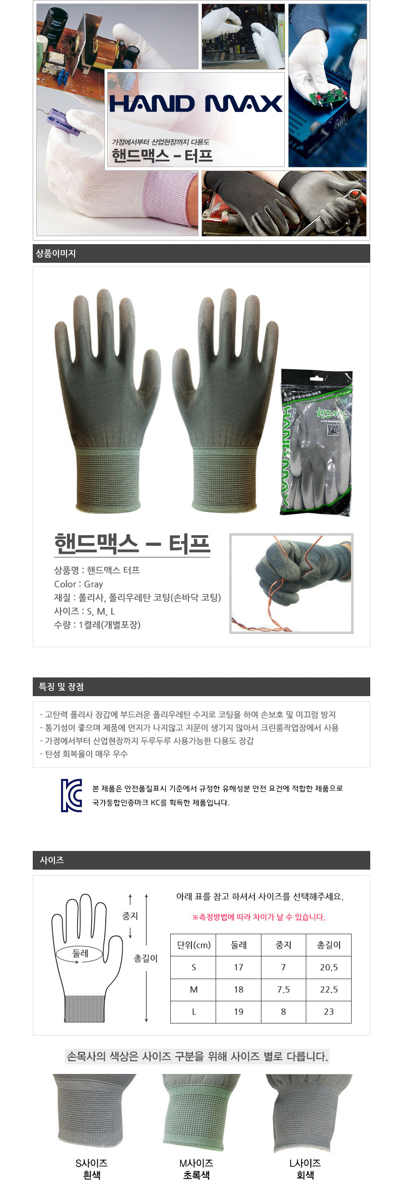 품명 ■ 고탄력 폴리사 장갑에 부드러운 폴리우레탄 수지로 코팅을 하여 손보호 및 미끄럼 방지 ■ 통기성이 좋으며 제품에 먼지가 나지않고 지문이 생기지 않아서 크린룸작업장에서 사용 ■ 가정에서부터 산업현장까지 두루두루 사용가능한 다용도 장갑