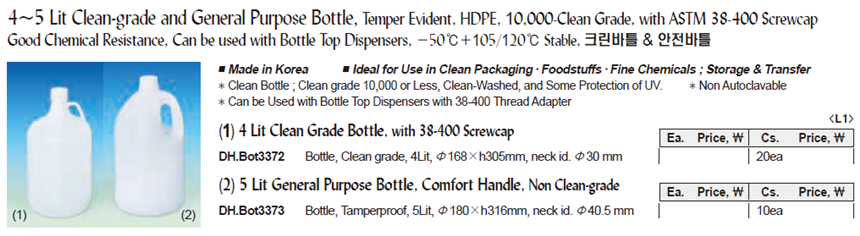 4~5 Lit Clean-grade and General Purpose Bottle, Temper Evident, HDPE, 10,000-Clean Grade, with ASTM 38-400 Screwcap Good Chemical Resistance, Can be used with Bottle Top Dispensers, -50℃+105/120℃ Stable, 크린바틀 & 안전바틀
