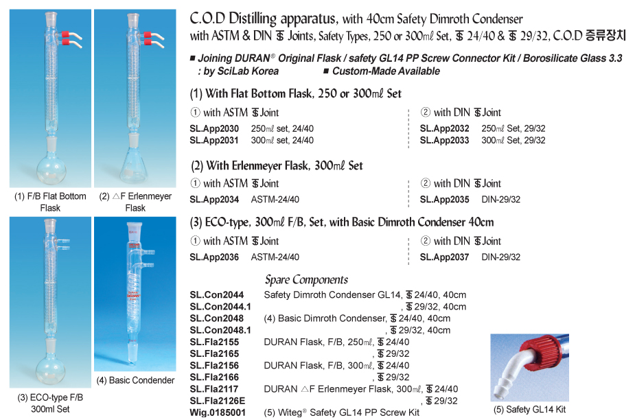 C.O.D Distilling apparatus, with 40cm Safety Dimroth Condenser with ASTM & DIN Joints, Safety Types, 250 or 300㎖ Set, 24/40 & 29/32