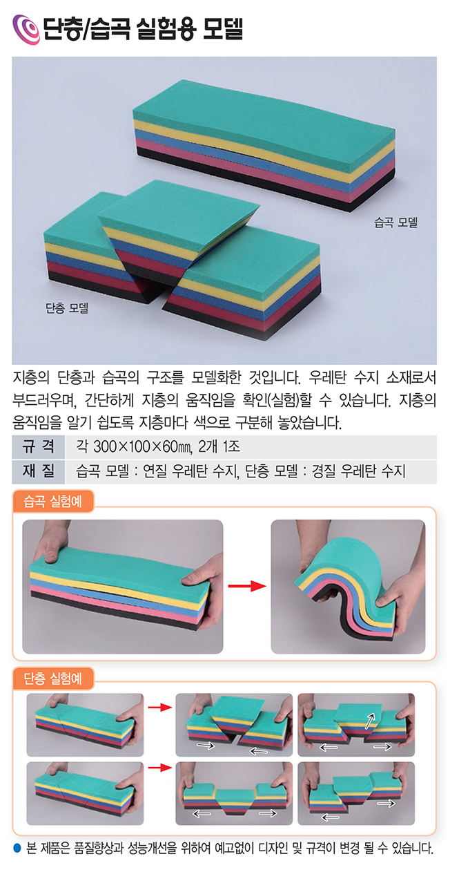 품명 특징 지층의 단층과 습곡의 구조를 모델화함 우레탄 수지 소재로서 부드러우며, 간단하게 지층의 움직임을 확인 지층의 움직임을 알기 쉽도록 지층마다 색으로 구분 형식 재질: 연질 우레탄 수지(습곡모델), 경질 우레탄 수지(단층모델)