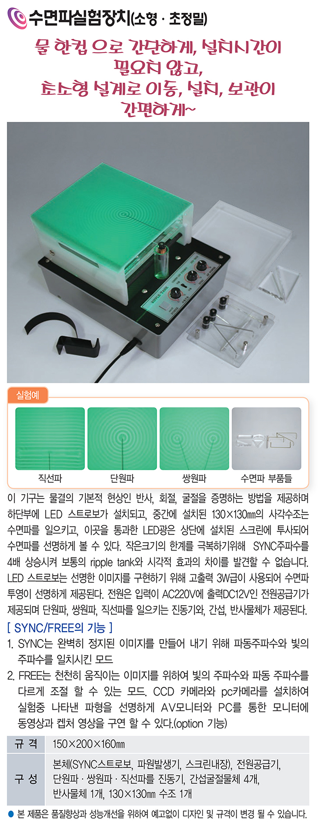 품명 LED 스트로보와 상단 투영 조명을 이용해 반사·회절·굴절 등 다양한 파동 형태를 관찰할 수 있는 소형 수면파 실험장치로, 직선파·단원파·쌍원파 실험이 가능한 교육용 파동 실험기입니다.