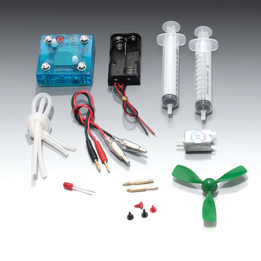 개요 : 에너지 순환의 작동 모델로 태양전지, 수동식 발전기 또는 건전지를 이용하여 전기를 발생시키고, 발생된 전기가 PEM 연료전지에 가득찬 물을 산소와 수소로 전기분해 시킵니다. 발생된 수소와 산소는 주사기에 포집하여 연소실험과 양방기능을 가지므로 다시 전기를 발생시킬 수 있습니다.