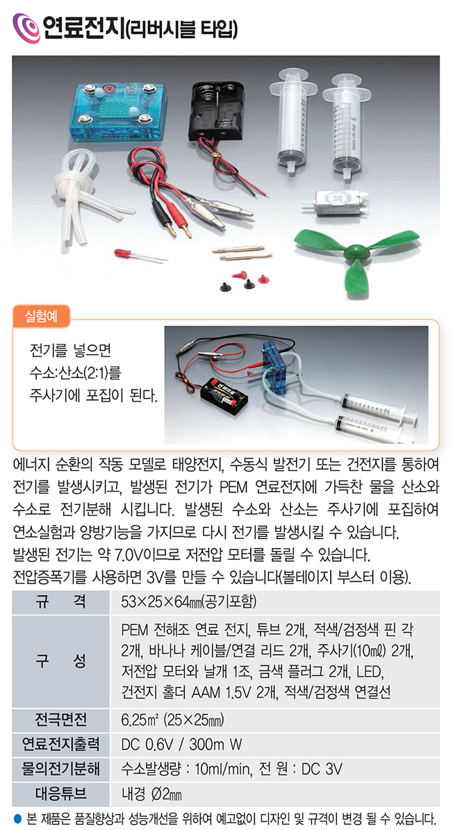 품명 에너지 순환의 작동 모델로 태양전지, 수동식 발전기 또는 건전지를 이용하여 전기를 발생시키고, 발생된 전기가 PEM 연료전지에 가득찬 물을 산소와 수소로 전기분해 시킵니다. 발생된 수소와 산소는 주사기에 포집하여 연소실험과 양방기능을 가지므로 다시 전기를 발생시킬 수 있습니다.