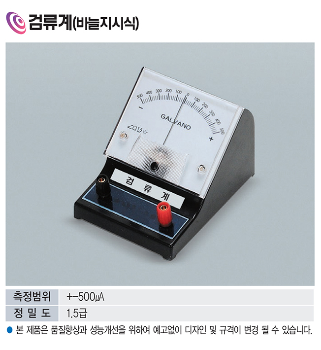 품명 바늘지시식 아날로그 검류계로 ±500?A 미세전류 측정에 적합합니다. 직관적 눈금 표시와 1.5급 정밀도로 과학·물리 실험용 기본 전류계로 사용하기 좋습니다.