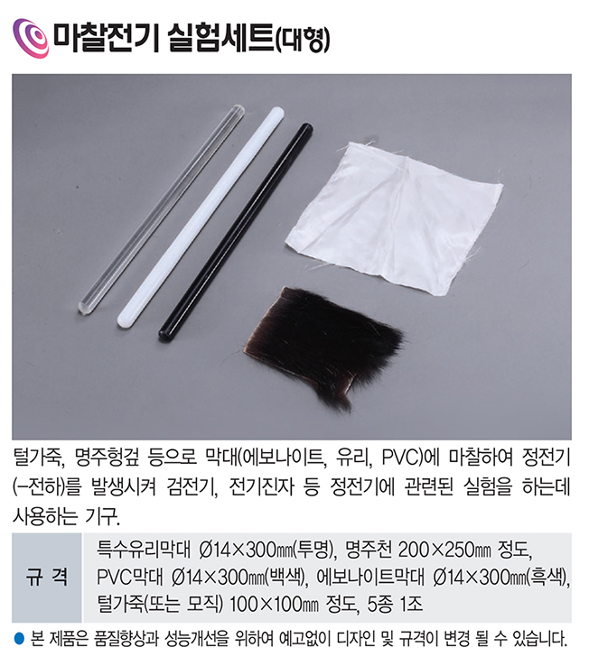 품명 유리·PVC·에보나이트 막대와 명주천·털가죽으로 구성된 대형 마찰전기 실험세트입니다. 재질별 대전 특성을 비교하며 정전기 발생 원리를 학습하기에 적합한 교육용 실험 교구입니다.