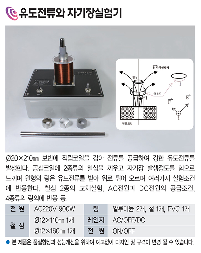 교류·직류 조건, 철심 유무, 재질별 링(알루미늄/철/PVC) 반응 등 다양한 실험 구성이 가능해 교육 효과가 뛰어납니다.