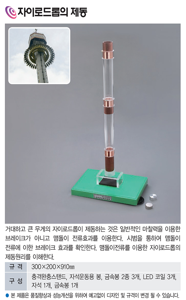 품명 거대하고 큰 무게의 자이로드롭이 제동하는 것은 일반적인 마찰력을 이용한 브레이크가 아니고 맴돌이 전류효과를 사용한다. 시범을 통하여 맴돌이 전류에 의한 브레이크 효과를 확인한다. 맴돌이전류를 이용한 자이로드롭의 제동원리를 이해한다.