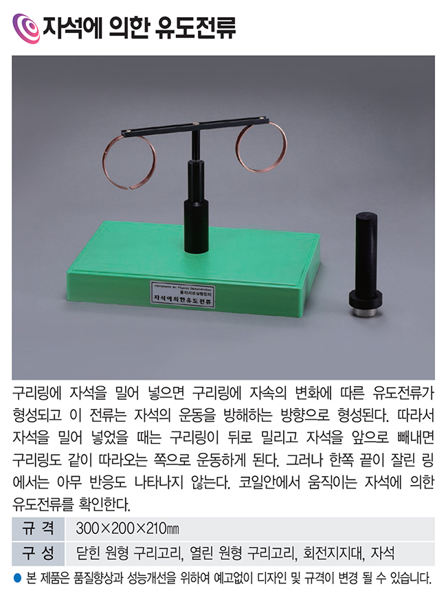 품명 구리링에 자석을 밀어 넣으면 구리링에 자속의 변화에 따른 유도전류가 형성되고 이 전류는 자석의 운동을 방해하는 방향으로 형성된다. 따라서 자석을 밀어 넣었을 때는 구리링이 뒤로 밀리고 자석을 앞으로 빼내면 구리링도 같이 따라오는 쪽으로 운동하게 된다. 그러나 한쪽 끝이 잘린 링에서는 아무 반응도 나타나지 않는다. 코일 안에서 움직이는 자석에 의한 유도전류를 확인한다.