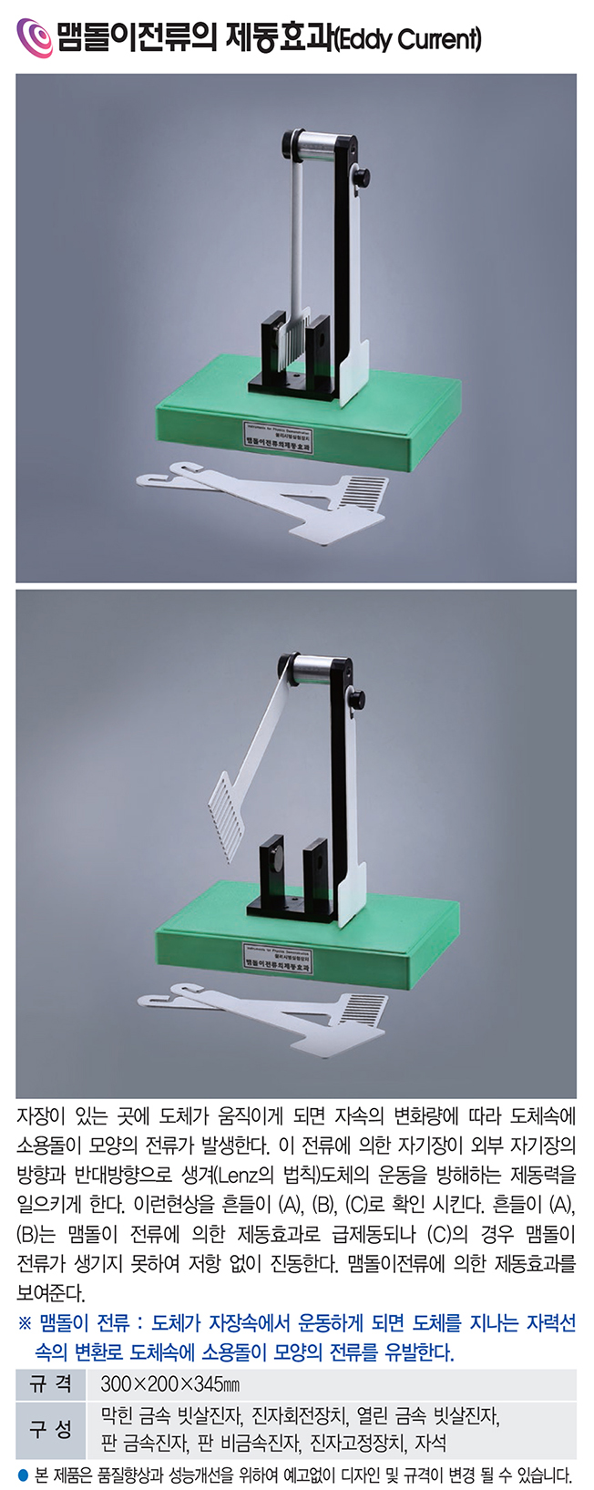 품명 자장이 있는 곳에 도체가 움직이게 되면 자속의 변화량에 따라 도체속에 소용돌이 모양의 전류가 발생한다. 이 전류에 의한 자기장이 외부 자기장의 방향과 반대방향으로 생겨(Lenz의 법칙)도체의 운동을 방해하는 제동력을 일으키게 한다.