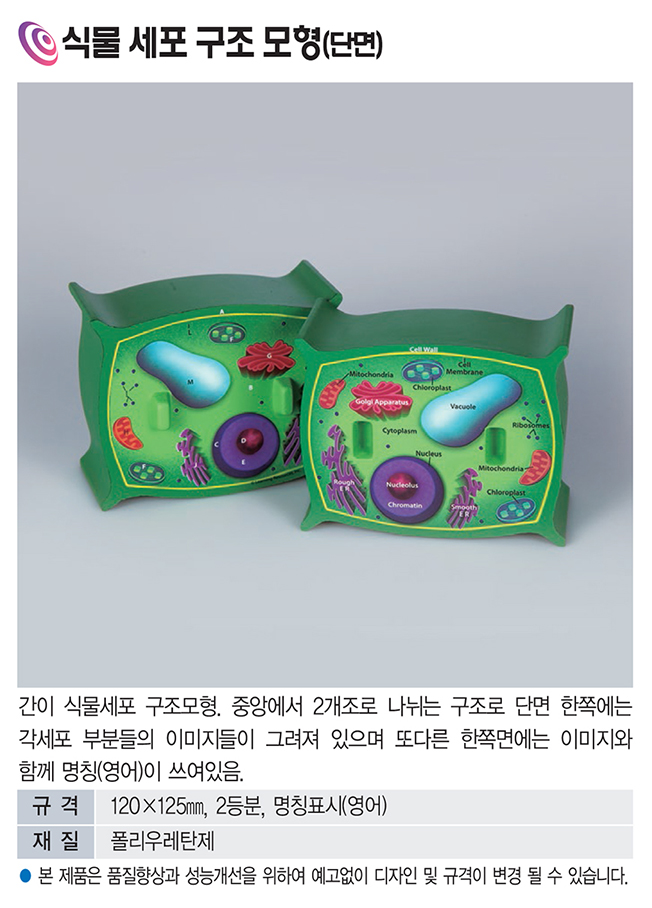 품명 2등분 구조의 식물세포 단면 모형으로, 이미지와 영어 명칭이 함께 표시되어 생명과학 학습에 효과적입니다. 내구성 높은 폴리우레탄 재질로 교육 현장에서 활용도가 뛰어난 교구입니다.