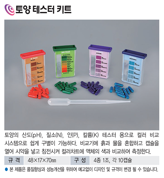 품명 특징 토양의 산도, 질소, 인, 칼륨 테스터 용으로 컬러 비교 시스템으로 쉽게 구별이 가능함 비교기에 흙과 물을 혼합하고 캡슐을 열어 시약을 넣고 침전시켜 컬러차트에 액체의 색과 비교하여 측정함 4종 1세트, 각 10캡슐