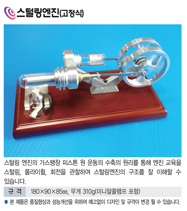품명 스털링엔진 고정식 모델은 가스팽창과 수축에 의한 피스톤 운동과 플라이휠 회전을 직접 관찰하며 열기관의 구조와 원리를 이해할 수 있는 교육·실험용 엔진 모형입니다.