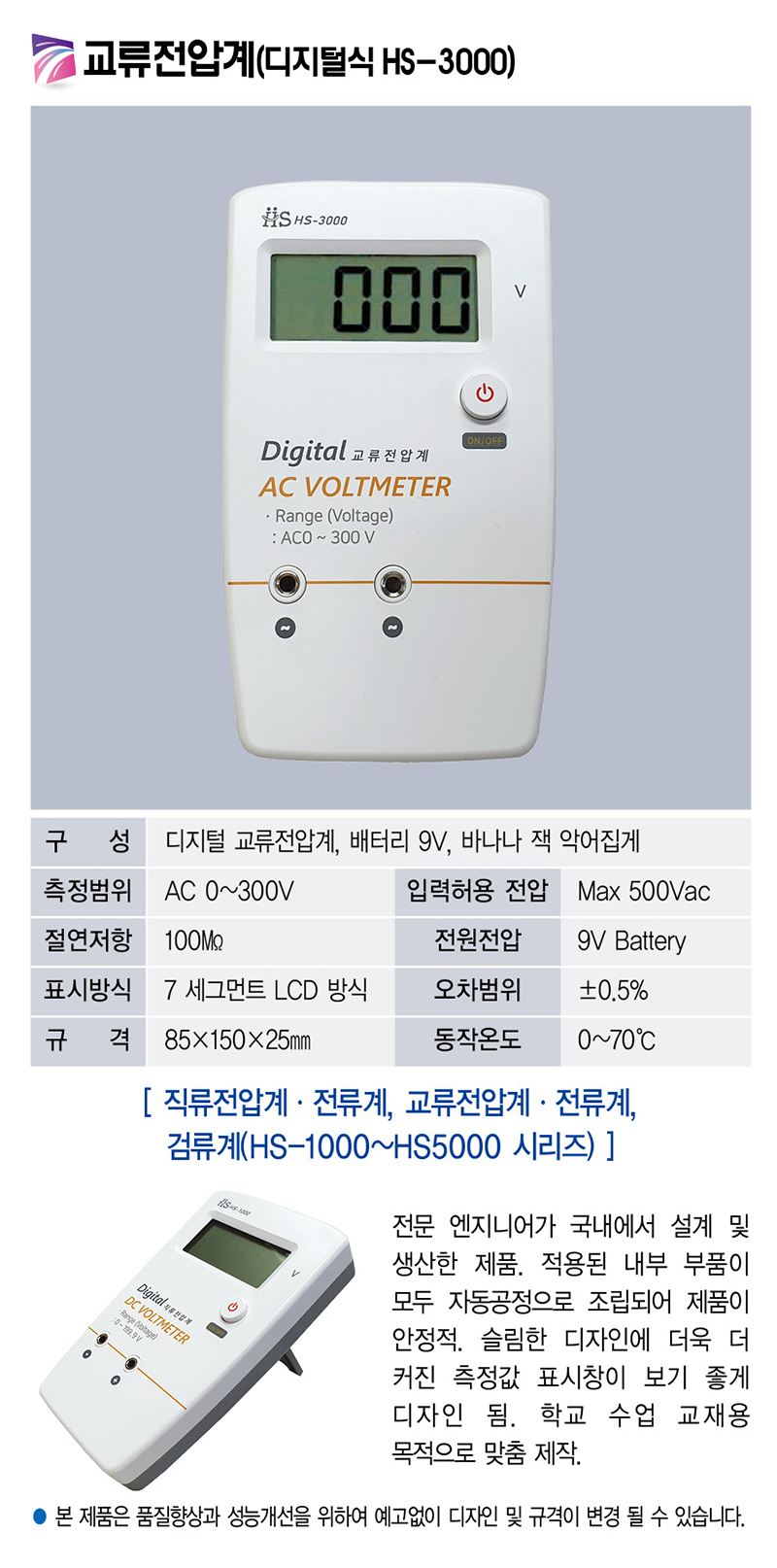 품명 디지털 교류전압계는 AC 0~300V 측정이 가능한 교육용 전압측정기로, 큰 LCD 화면과 안정된 설계가 특징이며 실험·수업에서 활용하기 좋은 디지털 AC 전압계입니다.