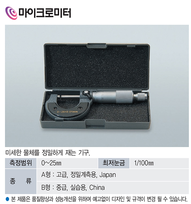 품명 0~25mm 범위를 1/100mm 정밀도로 측정할 수 있는 마이크로미터로, 고급형 정밀 계측용과 실습용 모델로 선택 가능하며 미세한 물체를 정확하게 재는 실험·공구 장비입니다.