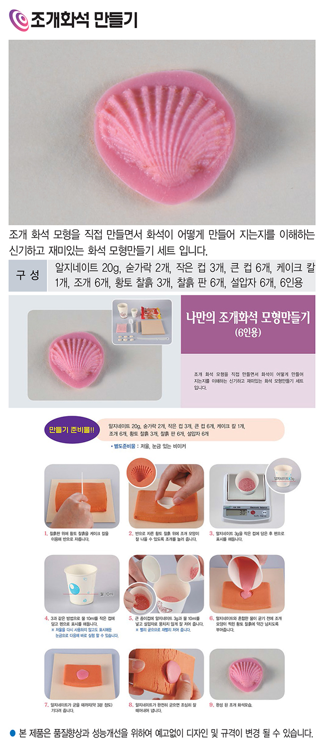 개요 : 조개 화석 모형을 직접 만들면서 화석이 어떻게 만들어지는지를 이해하는 신기하고 재미있는 화석 모형 만들기 세트입니다.