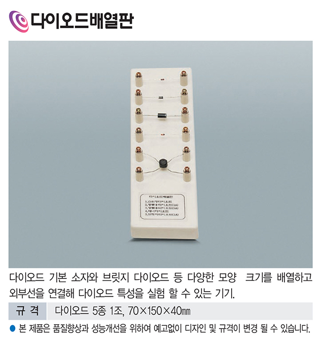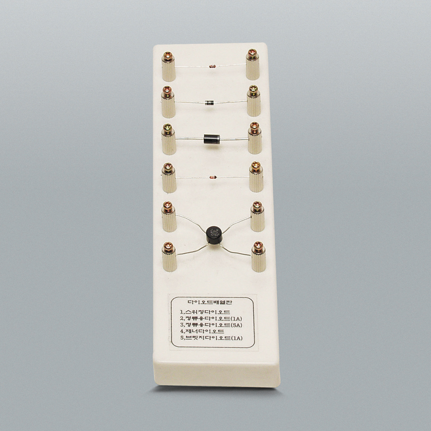 품명 다이오드 기본 소자와 브릿지 다이오드 등 다양한 모양 크기를 배열하고 외부선을 연결해 다이오드 특성을 실험할 수 있는 기기.