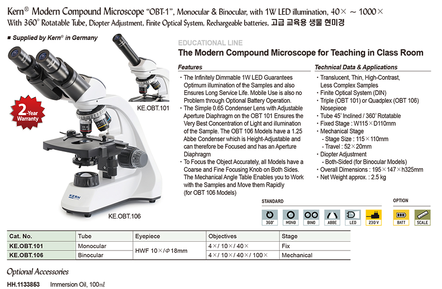 Kern® Modern Compound Microscope “OBT-1”, Monocular & Binocular, with 1W LED illumination, 40× ~ 1000× With 360°Rotatable Tube, Diopter Adjustment, Finite Optical System