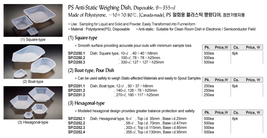 PS Anti-Static Weighing Dish, Disposable, 9~355㎖Made of Polystyrene, -10+70/80℃, [ Canada-made ]