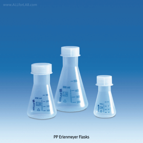 VITLAB® PP Erlenmeyer Flask, with Wide-neck, Screwcap & Blue-scale, 50~ 1 ,000㎖Made of Polypropylene(PP), DIN/ISO, [ Germany-made ] , PP 스크류 캡 삼각 플라스크, 광구, 스토퍼 겸용