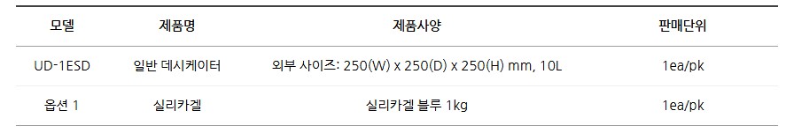 품명 정전기 방지 ABS 소재로 제작된 UD-1ESD 데시케이터. 10L 용량, 조절형 선반, 실리카겔 사용으로 저습도 유지에 최적화된 실험실·전자부품 보관용 건조함.
