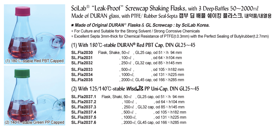 “Leak-Proof” Screwcap Shaking Flasks, with 3 Deep-Baffles 50~2000㎖ Made of DURAN glass, with PTFE/ Rubber Seal-Septa