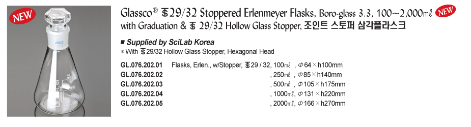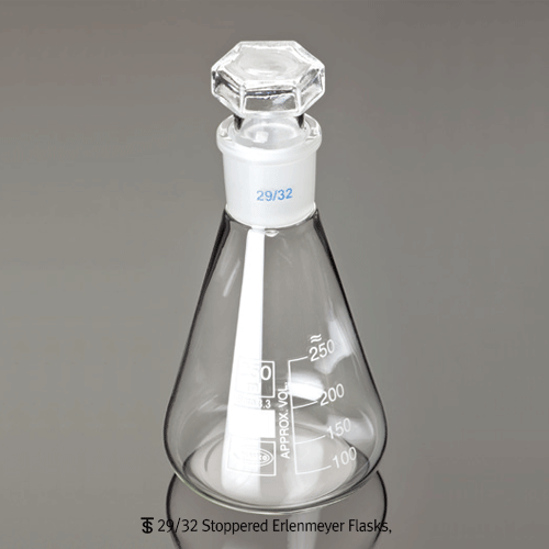 Glassco® 29/32 Stoppered Erlenmeyer Flasks, Boro-glass 3.3, 100~2,000㎖ with Graduation & 29/32 Hollow Glass Stopper