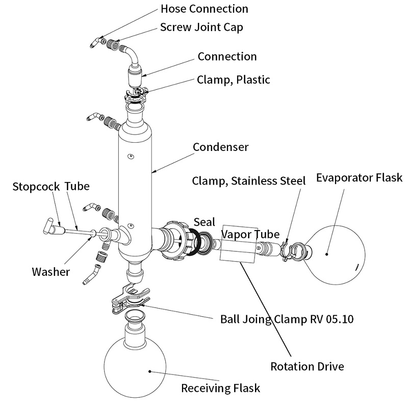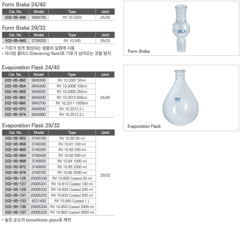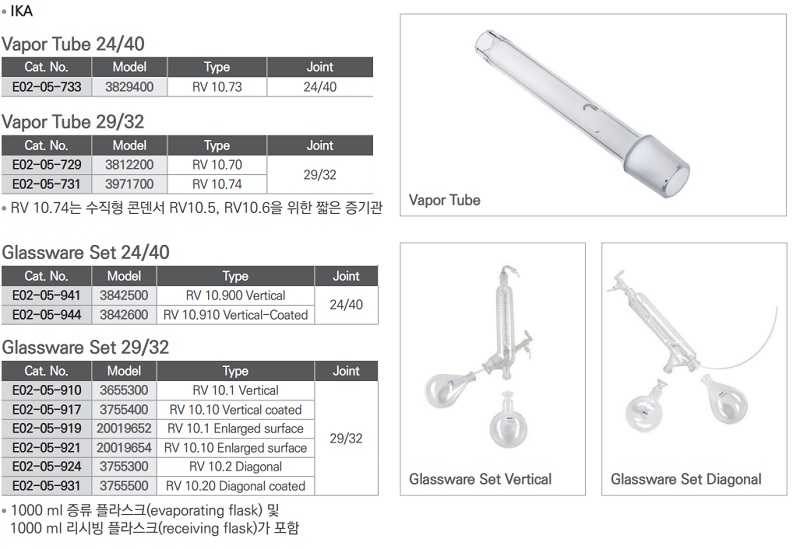- ● 1000 ml 증류 플라스크(evaporating flask) 및 1000 ml 리시빙 플라스크(receiving flask)가 포함