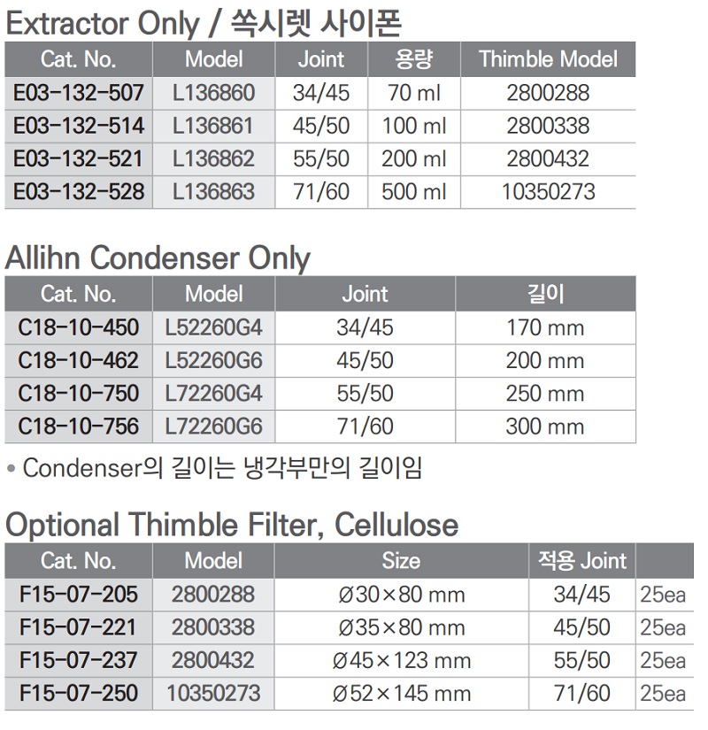 | Cat. No | Model | 용량 | 상부 Joint | Flask Joint |