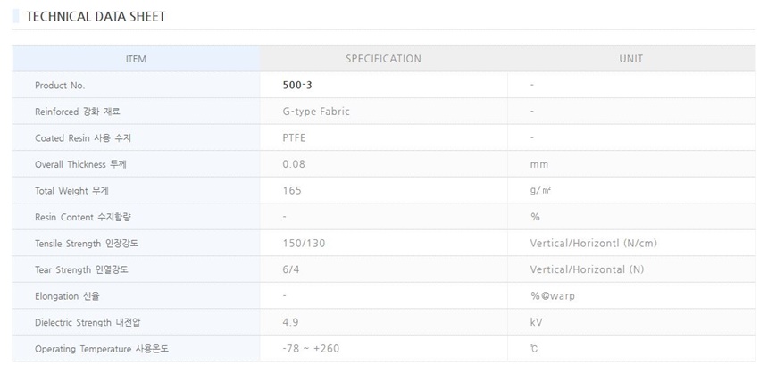 ● 특징 : PTFE Coated Glass Fabric 유리섬유에 PTFE를 코팅한 제품으로 다양한 두께와 폭을 가지고 있습니다.