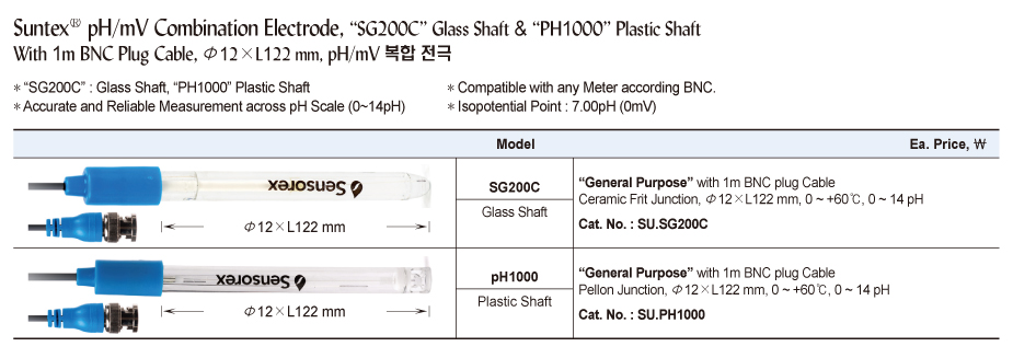 Suntex® pH/mV Combination Electrode, “SG200C” Glass Shaft &