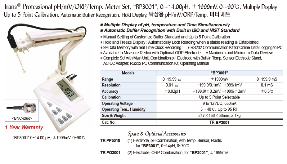 Trans® Professional pH/mV/ORP/Temp. Meter Set, “BP3001”, 0~14.00pH, ±1999mV, 0~90℃, Multiple Display Up to 5 Point Calibration, Automatic Buffer Recognition, Hold Display