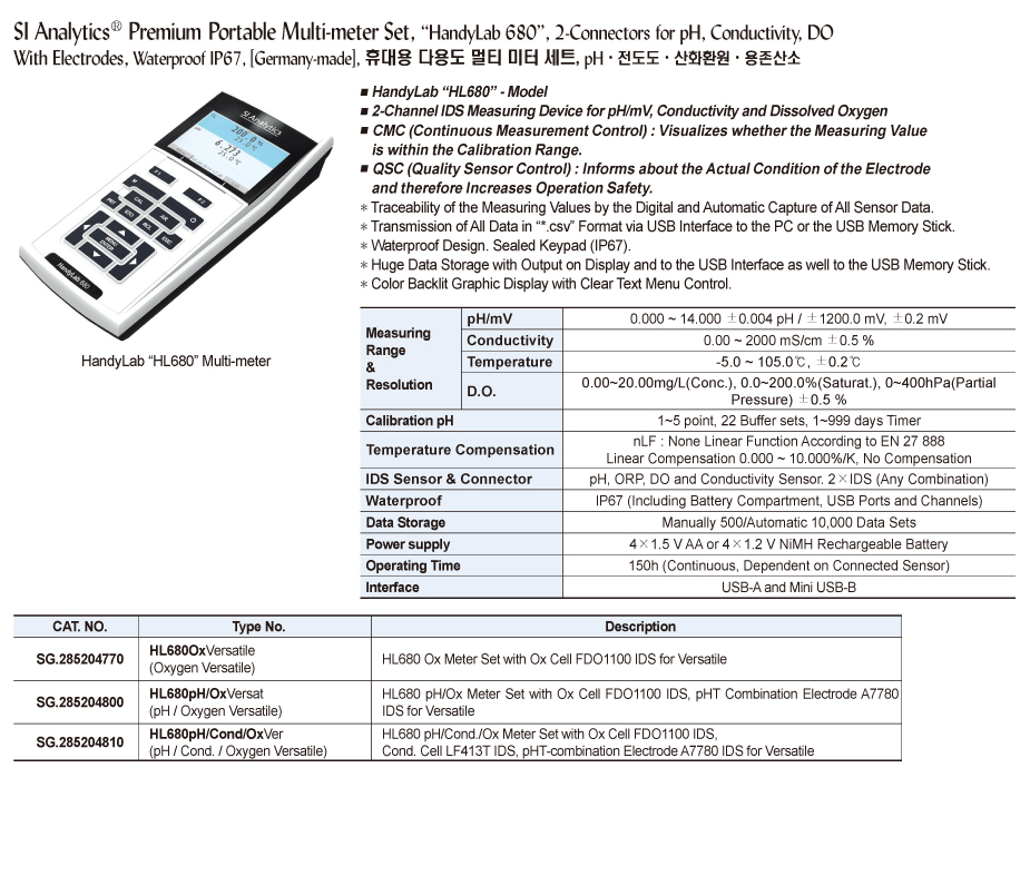 SI Analytics® Premium Portable Multi-meter Set, “HandyLab 680”, 2-Connectors for pH, Conductivity, DO With Electrodes, Waterproof IP67, [ Germany-made ]