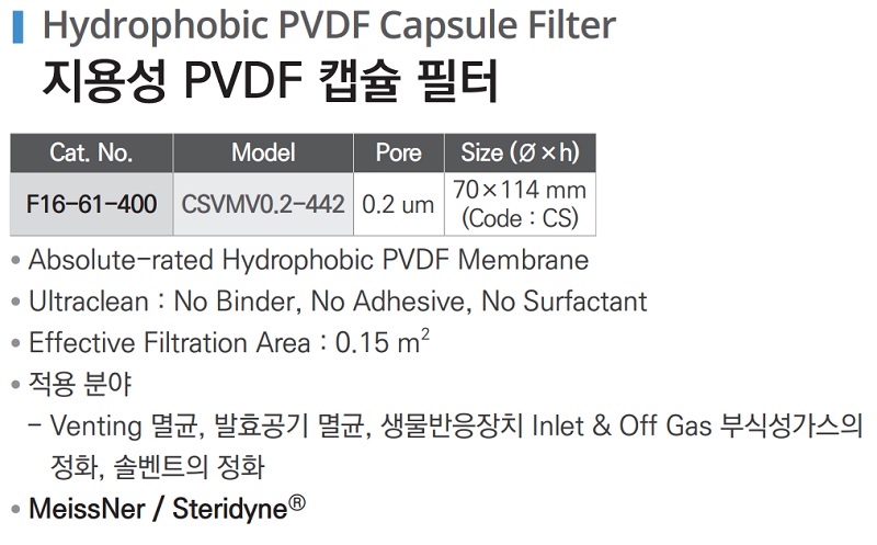 공통 Specification* Housing Material : PP* Filtration Media : PVDF, PP, PTFE, PES* Media Support Component : PP* Sealing Method : Thermal Bonding* Maximum Operating Pressure* Liquid : 5.2 bar at 38℃* Gas : 3.4 bar at 38℃* Operating Temperature Range : 0℃~38℃* Max. Temperature : 71℃ at 2.4 bar* Vent Port- Two Luer-Lock Port for Venting, Draining, Sampling* Inlet Outlet : 1/4" MNPT Standard* Optional- 1" Sanitary Flange (Code : 00)- 3/8" Horsbarb (Code : 22)- 1/2" Horsbarb (Code : cc)- 3/8" FNPT (Code : 55)- 3/8" MNPT (Code : 66)* Size : Φ70×h114 mm (Standard, Code : CS)* Optional- Φ70×h175 mm (Code : CL)- Φ57×h83 mm (Code : CF)- Φ32×h140 mm (Code : CM)- Φ32×h159 mm (Code : CK)* Sterilization : Autoclave at 121℃ (60 min), 125℃ (45 min)* 제조 환경 : Cleanroom, 100% Integrity Tested During Manufacture.