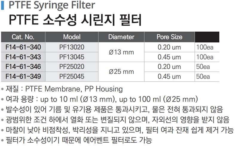 PTFE 소수성 시린지 필터 PTFE Syringe Filter F14-61-340