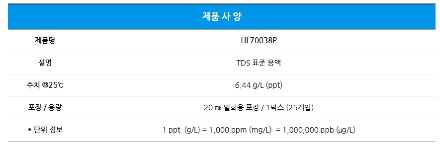 HI 70038P (6.44ppt)는 TDS(총용존고형물) 측정기의 정확한 교정용 표준용액입니다.