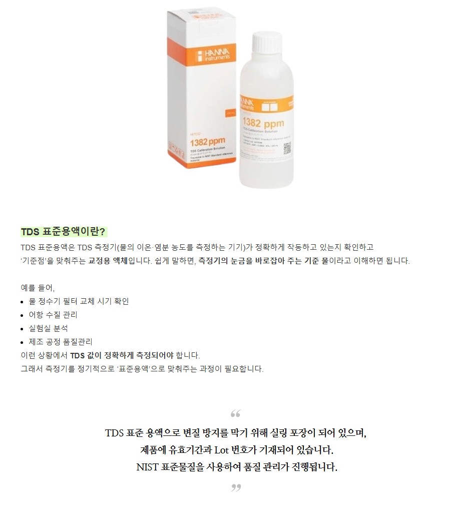품명 HI7032M TDS 표준용액은 1382ppm 농도로 제작된 고정밀 교정액으로, 실링 포장 및 NIST 표준물질 기반으로 안정적인 교정 품질을 제공합니다.