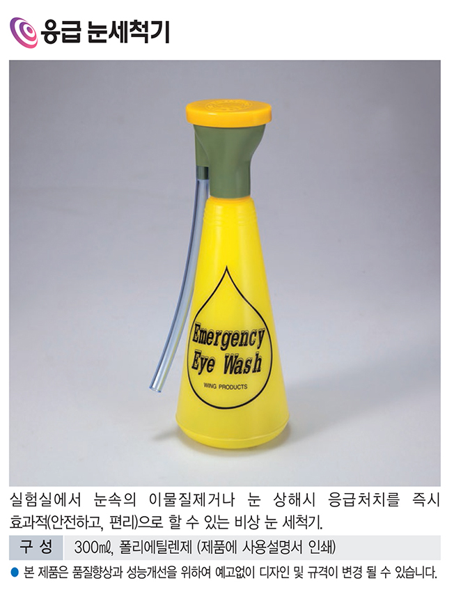 개요 : 실험실에서 눈 속의 이물질제거나 눈 상해 시 응급 처치를 즉시 효과적(안전하고, 편리)으로 할 수 있는 비상 눈 세척기. 식염수는 별도로 구매하여 사용하세요.