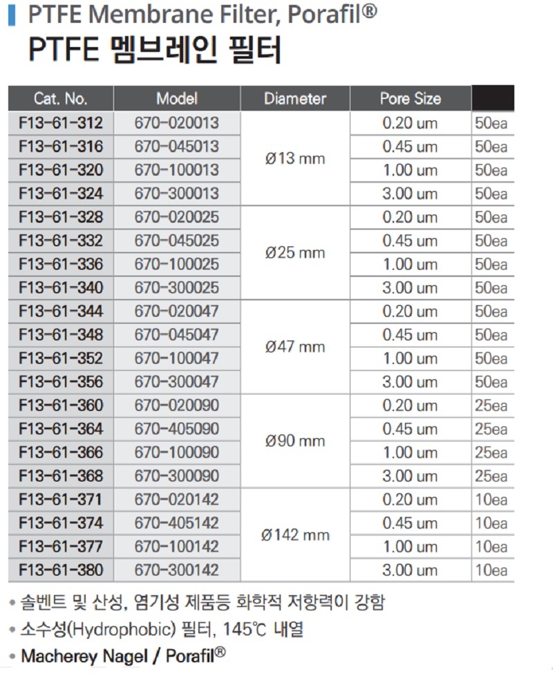 품명 ■ 솔벤트 및 산성, 염기성 제품등 화학적 저항력이 강함 ■ 소수성(Hydrophobic) 필터, 145℃ 내열 ■ Macherey Nagel / Porafil®