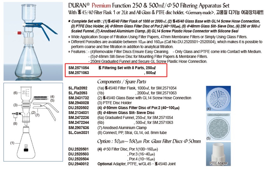 DURAN® Premium Function 250 & 500㎖/Φ47 Filtering Apparatus SetWith 45/40 Filter Flask 1 or 2Lit and All Glass & PTFE disc holder, , 고품질 다기능 여과장치세트